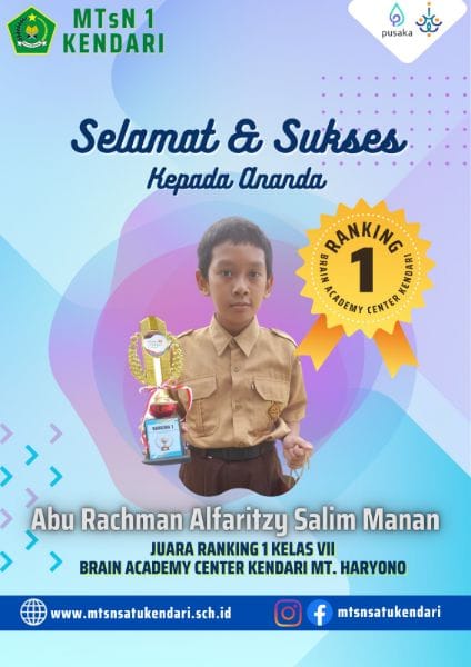 Kendari (Humas Sultra) – Prestasi MTs Negeri 1 Kendari terus mengalir baik akademik maupun non-akademik. Kali ini, Abu Rachman Alfaritzy Salim Manam siswa kelas VII menorehkan namanya dalam daftar prestasi sebagai juara 1 dalam lomba Rengking Satu. Lomba Rengking Satu ini merupakan salah satu lomba yang diadakan oleh Brain Academy Center Kendari.